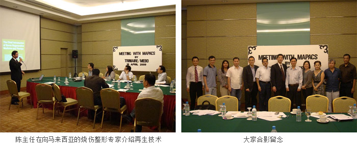 2009年4月18日,馬來西亞2009年燒傷整形外科常務(wù)委員會議在吉隆坡Boulevard Hotel召開,參加會議的有來自各州、省、市的重要的燒傷、整形專家約15人。陳永翀主任應(yīng)邀參加會議,并以“The chief introduction of burns regenerative medicine and therapy”為題進(jìn)行專題報告,在陳主任的30分鐘的演講中,向各位燒傷整形專家闡述了全厚皮燒傷通過激活潛能再生細(xì)胞轉(zhuǎn)化為干細(xì)胞,然后利用干細(xì)胞培養(yǎng)再生技術(shù)實現(xiàn)原位再生復(fù)原皮膚器官的過程,同時向大家展示了眾多的大面積特重度燒傷的臨床病例,大家聽后非常興奮和激動,各位專家爭先恐后地舉手提問,陳主任和助手們則逐一進(jìn)行解答,大家還紛紛詢問何時能夠買到MEBO和引進(jìn)該技術(shù),提問和討論階段占了1個半小時。最后,燒傷學(xué)會主席Dr. Peter Wong向陳永翀主任發(fā)出邀請,邀請陳主任出席2010由馬來西亞燒傷學(xué)會主辦的在馬來西亞Kuching市召開的亞洲燒傷整形大會并做專題演講。