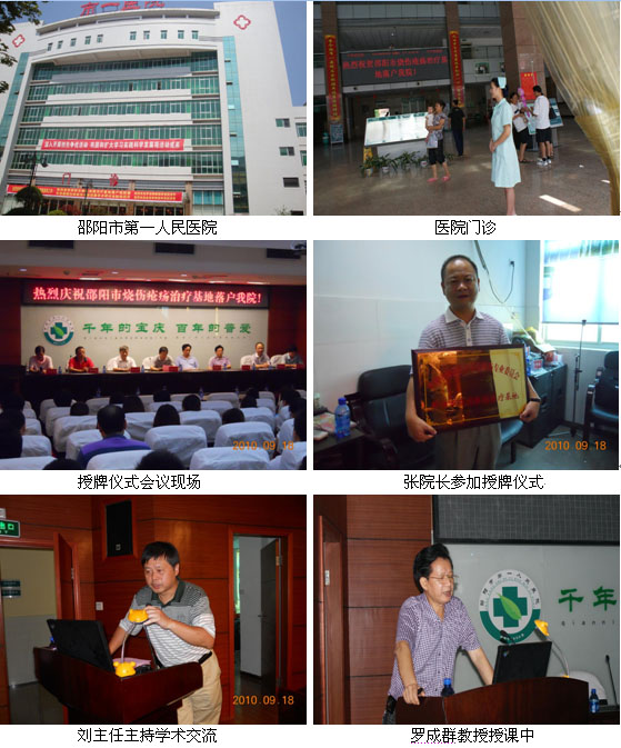 2010年9月18日8時,邵陽市第一人民醫(yī)院隆重舉行了中國中西結(jié)合學(xué)會燒傷專業(yè)委員會邵陽市燒傷治療培訓(xùn)基地授牌儀式。本次儀式由該院范副院長主持,該院張院長致辭,中國中西醫(yī)結(jié)合學(xué)會燒傷專業(yè)委員會委員、臨床醫(yī)療部金黨軍主任宣讀了關(guān)于批準成立《中國中西結(jié)合學(xué)會燒傷專業(yè)委員會邵陽市燒傷治療培訓(xùn)基地》的批復(fù),邵陽市政府秘書長,市衛(wèi)生局領(lǐng)導(dǎo),市學(xué)會秘書長分別致辭祝賀。湖南省醫(yī)學(xué)會劉祖貞秘書長參加了授牌儀式并為該院授牌。會后邵陽市電視臺在晚間新聞做了系統(tǒng)報道,介紹了燒傷皮膚再生醫(yī)療技術(shù)近二十幾年來在湖南省推廣應(yīng)用的情況;并對邵陽市第一人民醫(yī)院積極引燒傷皮膚再生醫(yī)療技術(shù)這一進先進的技術(shù),造福百姓給與了充分肯定。湖南省醫(yī)學(xué)會劉祖貞秘書長在致辭中特別強調(diào)了邵陽市人民醫(yī)院一定要發(fā)揮區(qū)域龍頭作用,盡快掌握徐榮祥教授發(fā)明的新技術(shù)、新成果,使邵陽地區(qū)的新技術(shù)、新成果推廣普及工作再上一個新臺階,福祉基層百姓。