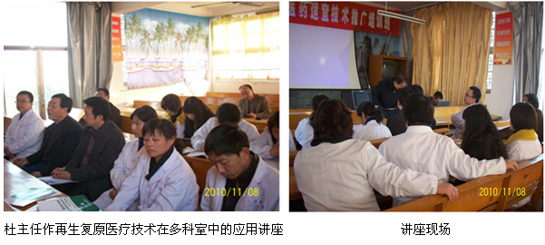 2010年11月8日下午15:00,中國中西醫(yī)結合學會燒傷專業(yè)委員會常委、北京美寶燒傷創(chuàng)瘍研究所臨床部研究員杜福勤教授和學會駐江蘇省蘇北區(qū)辦事處劉恒主任應阜寧縣東溝鎮(zhèn)中心醫(yī)院周建峰院長的邀請,為該院外科、肛腸科、婦產科、皮膚科等科室的主任、醫(yī)護人員20余人作了“再生復原醫(yī)療技術在多科室應用的學術講座”,該院外科陳為斌主任主持了講座,杜教授在授課中利用大量的臨床圖片資料向大家介紹了再生復原醫(yī)療技術在外科、骨科、肛腸科、婦產科、皮膚科中的適應癥及治療方法和愈后效果。該院領導及與會人員對再生醫(yī)療技術良好的治療效果給予了肯定,并提出了在臨床應用該項技術時所遇到的問題,得到了杜教授耐心地解答。