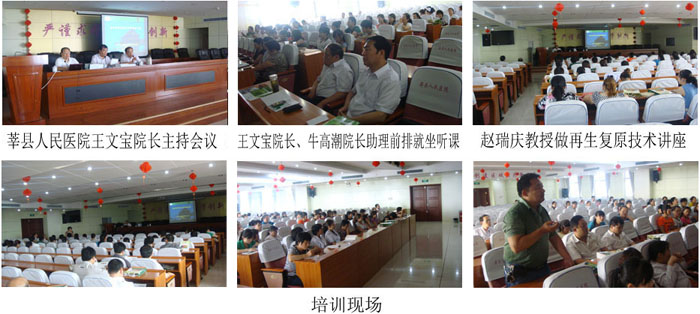 2012年7月3日,經(jīng)由魯西莘縣由衛(wèi)生局批準(zhǔn),莘縣人民醫(yī)院牽頭,成功地舉辦了一期再生復(fù)原技術(shù)培訓(xùn)班。培訓(xùn)對(duì)象主要來(lái)自莘縣人民醫(yī)院、莘縣中醫(yī)院、莘縣婦幼保健院外科、骨科、急診科、婦科的醫(yī)務(wù)骨干56人。會(huì)議由莘縣人民醫(yī)院王文寶院長(zhǎng)主持。牛高潮院長(zhǎng)助理在培訓(xùn)前介紹了培訓(xùn)班的籌備情況。
