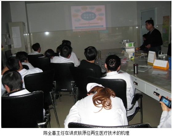 2012年12月10日下午兩點(diǎn),中國(guó)中西醫(yī)結(jié)合學(xué)會(huì)燒傷專業(yè)委員、北京美寶燒傷創(chuàng)瘍研究所臨床部副主任醫(yī)師陳全喜應(yīng)邀來到信陽(yáng)市中醫(yī)院與燒傷科、外科、婦科、內(nèi)分泌科的醫(yī)師進(jìn)行皮膚原位再生醫(yī)療技術(shù)的培訓(xùn)。