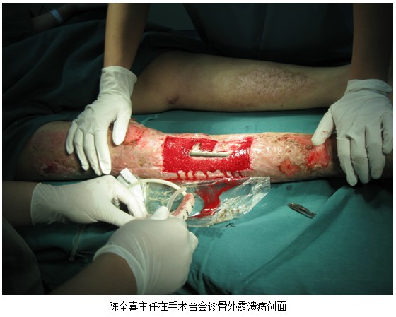 患者王雙,男,43歲。因機(jī)械事故造成右腿脛骨中段粉碎性骨折。用鋼板固定住院治療70天,傷口不愈合。陳全喜主任會(huì)診后認(rèn)為傷口不愈合有3個(gè)因素:局部組織已纖維化,創(chuàng)面得不到營(yíng)養(yǎng)、細(xì)胞不分裂增殖③創(chuàng)面得不到一個(gè)良好的濕潤(rùn)環(huán)境,所以局部組織細(xì)胞不增殖分化,傷口不愈合,羅主任及大夫們認(rèn)真汲取了建議。