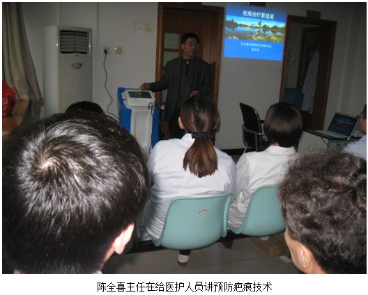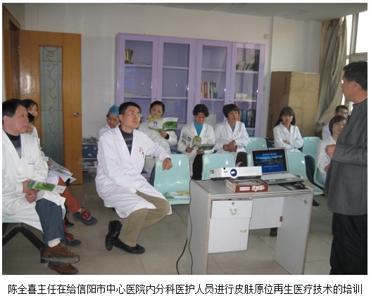 2012年11月18日,中國(guó)中西醫(yī)結(jié)合學(xué)會(huì)燒傷專業(yè)委員會(huì)委員、北京美寶燒傷創(chuàng)瘍研究所臨床部專家陳全喜主任受信陽(yáng)市中心醫(yī)院內(nèi)分泌科主任郭向陽(yáng)的邀請(qǐng)和區(qū)域經(jīng)理李瑩瑩一同到信陽(yáng)市中心醫(yī)院內(nèi)分泌科進(jìn)行全科人員的皮膚原位再生醫(yī)療技術(shù)的培訓(xùn)。