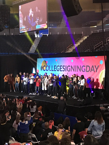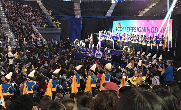 2019年5月1日上午,由前第一夫人米歇爾· 奧巴馬創(chuàng)立的大學定校日活動(CollegeSigningDay)在加州大學洛杉磯分校隆重舉行,來自全加州眾多高中的上萬名學生參加了這一盛會。一系列的慶祝表演節(jié)目不?;钴S現(xiàn)場氣氛,加州大學總校長Janet和洛杉磯分校校長Gene以及一些體育和演藝界明星出場鼓勵學生,米歇爾· 奧巴馬在會上壓軸出場,發(fā)表十幾分鐘的演講鼓勵中學生特別是那些低收入家庭的學生刻苦學習,努力上大學,創(chuàng)造光明未來。