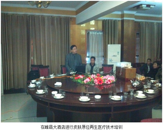 睢縣位于河南省商丘市西南角,是全國運(yùn)動會水上比賽的場所,有著五湖相連風(fēng)景大世界美稱。2012年11月4號,中國中西醫(yī)結(jié)合學(xué)會燒傷專業(yè)委員會委員、北京美寶燒傷創(chuàng)瘍研究所臨床部專家陳全喜和河南技術(shù)推廣人賀杰鋒應(yīng)邀來到了睢縣公療醫(yī)院。燒傷科主任余  力及全科醫(yī)護(hù)人員在主任陳全喜的帶領(lǐng)下,認(rèn)真學(xué)習(xí)“人體皮膚原位再生醫(yī)療技術(shù)”。