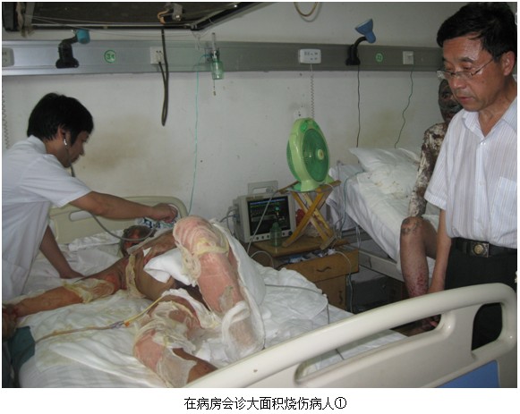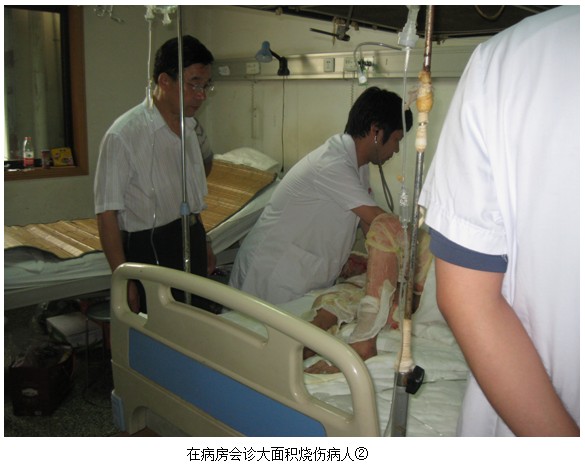 陳全喜主任到達(dá)油田醫(yī)院后,張主任介紹,該院來了一位大面積燒傷病人,燒傷面積87%,已經(jīng)2天了,并采用MEBT/MEBO進(jìn)行治療,并邀請(qǐng)陳主任確定是否達(dá)到了MEBO技術(shù)的要求。陳主任立即趕往病房,病人平穩(wěn)地躺在病床上,全身用MEBO油沙半暴露療法。經(jīng)檢查,各項(xiàng)指標(biāo)正常。會(huì)診后,陳主任較為滿意,陳主任與張主任確定將在科室晨起開會(huì)時(shí),做講座。