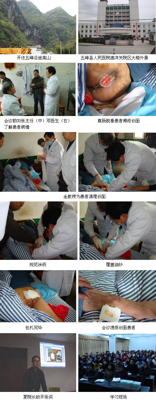五峰土家族自治縣位于鄂西南邊陲,距宜昌市200公里,無高等級公路,山大人稀。一路蜿蜒顛簸,金黨軍教授歷經(jīng)了三個半小時車程到達(dá)漁洋關(guān)鎮(zhèn)。得知金教授來院授課,醫(yī)院夏院長、醫(yī)務(wù)科李科長和外科張主任熱情地接待了金教授,雙方就醫(yī)院目前發(fā)展的情況及再生醫(yī)學(xué)近期所取得的成就做了簡單地交流。該院外科為骨科、普外科等,該科于今年二月初引進(jìn)新一代功能復(fù)合輔料創(chuàng)瘍貼,取得了不錯的臨床療效。2002年8月五峰縣漁洋關(guān)鎮(zhèn)唐黃坪煤礦發(fā)生重大瓦斯爆炸事故,八人遇難,第九人是由該院張主任應(yīng)用的濕性醫(yī)療技術(shù)和美寶濕潤燒傷膏將患者治愈,因此,再生醫(yī)療技術(shù)的神奇療效該院領(lǐng)導(dǎo)并不陌生??紤]到醫(yī)護(hù)人員的工作時間,夏院長和李科長將學(xué)術(shù)講座的時間定在晚上七點(diǎn)到九點(diǎn)。下午四點(diǎn),張主任陪同金教授到該院的住院病區(qū)進(jìn)行患者會診,其中一位為直腸脫垂、骶尾處褥瘡的老年患者,另一位患者為下肢潰瘍創(chuàng)面,創(chuàng)面較深。金教授分別為兩位患者清理創(chuàng)面后,進(jìn)行換藥,并制作油紗敷貼包扎,為醫(yī)務(wù)人員進(jìn)行換藥示范。