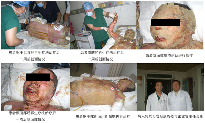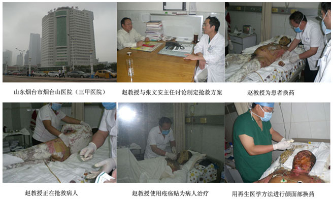 簡報三:9月14至9月24日,趙教授在山東煙臺市煙臺山醫(yī)院(三甲醫(yī)院)、中法友誼醫(yī)院指導(dǎo)搶救燒傷病人,該病人因苯甲酸爆炸致傷,燒傷面積為85%。奮戰(zhàn)一周,由傳統(tǒng)療法轉(zhuǎn)為再生技術(shù)治療,病人順利渡過休克期、感染期、糾正高鈉、高氯血癥、燒傷發(fā)熱癥狀,及時處理導(dǎo)管插入菌血癥險情,使病人轉(zhuǎn)危為安。