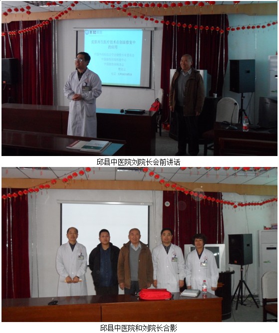 11月20日,邯鄲邱縣中醫(yī)院之行:邱縣中醫(yī)院的劉院長負(fù)責(zé)內(nèi)科,在治療壓瘡、糖尿病潰瘍上應(yīng)用再生技術(shù)多年,對MEBO技術(shù)非常熟悉,對再生技術(shù)的效果非??隙ā蟿⒃洪L認(rèn)真聽著樊教授對每一個病例的講解,每到關(guān)鍵之處便會記上幾筆,會后醫(yī)生們就一些臨床難題和樊教授進(jìn)行了交流。