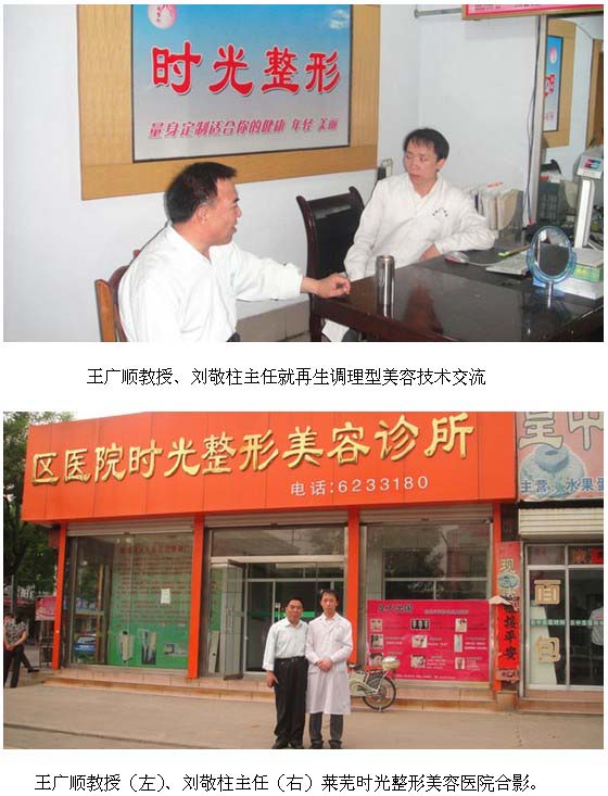 2011年5月17日~18日,應(yīng)萊蕪時(shí)光整形美容醫(yī)院劉敬柱主任的邀請(qǐng),北京再生醫(yī)學(xué)研究所醫(yī)療專家王廣順教授和山東辦事處劉治國(guó)同志來(lái)到該院,就“引進(jìn)應(yīng)用再生復(fù)原技術(shù)”進(jìn)行了交談,達(dá)成了“再生復(fù)原醫(yī)療技術(shù)”產(chǎn)品售后服務(wù)定點(diǎn)協(xié)議,并將再生復(fù)原技術(shù)為特色形成的美容項(xiàng)目界定為“再生調(diào)理型美容”項(xiàng)目。