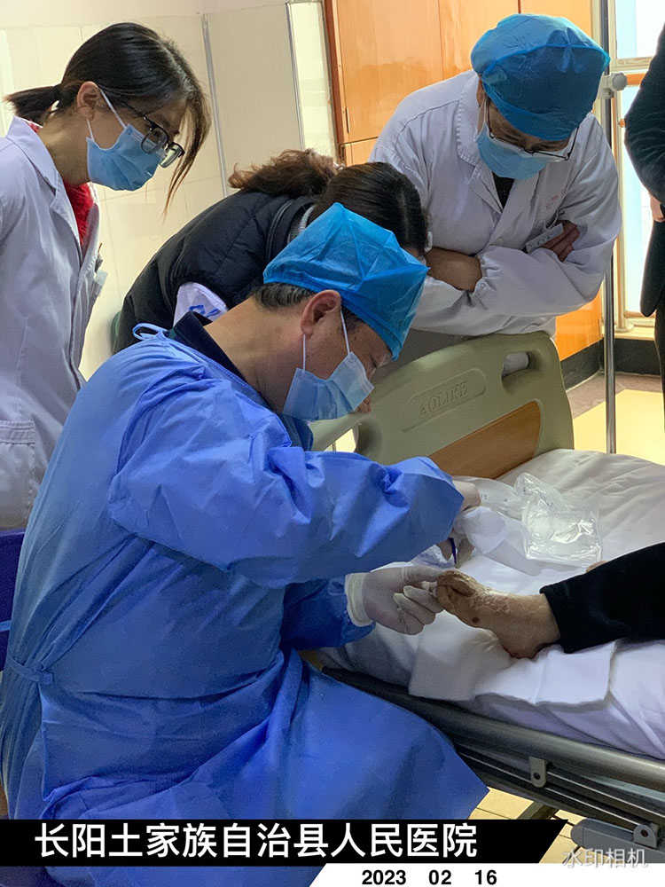2023年2月16日,中國中西醫(yī)結合學會燒傷專業(yè)委員會醫(yī)療部張強主任和湖北省中醫(yī)師協(xié)會燒傷與創(chuàng)面修復專業(yè)委員會黃彥勇主任,共同走訪湖北宜昌長陽土家族自治縣人民醫(yī)院心胸甲乳燒傷科及內分泌科,會診兩例燒傷患者和一例糖尿病潰瘍患者。其中腰部硫酸燒傷患者應用再生醫(yī)療技術治療效果良好,張主任建議患者用腹帶固定,避免活動脫落。另一例燒傷患者因在家處理不當導致創(chuàng)面形成黑痂,張主任就剝痂術后換藥方法和注意事項向張磊醫(yī)師提供了中肯方案。糖尿病潰瘍患者張主任示范了竇道換藥小技巧和再生醫(yī)療技術規(guī)范換藥。此次交流醫(yī)師們又學習到很多臨床經驗,紛紛向張主任表示誠摯感謝!會診結束,張強主任、黃彥勇主任同燒傷科劉勇主任深入探討燒傷慢創(chuàng)學科建設與發(fā)展趨勢,劉主任希望在學會的關注指導扶持下,規(guī)范發(fā)展,實實在在造?;鶎永习傩?!