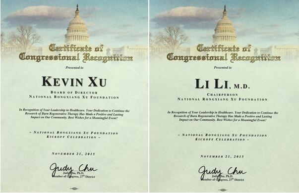 美國國會(huì)議員及洛杉磯教委委員對(duì)徐榮祥基金會(huì)的成立表示祝賀,并頒發(fā)證書。國會(huì)議員趙美心表示,目前美國正面臨醫(yī)生資源短缺、政府在醫(yī)學(xué)領(lǐng)域投資縮減的局面,并且在某些新技術(shù)與發(fā)明上已經(jīng)滯后,而在基金會(huì)贊助下成立的研究中心將有利于扭轉(zhuǎn)這一局面,在損傷器官領(lǐng)域作出突破性貢獻(xiàn)。趙美心認(rèn)為,徐榮祥基金會(huì)的成立不僅僅是為了向徐大夫致敬,更代表著一個(gè)可以令人類世世代代更健康的契機(jī)。