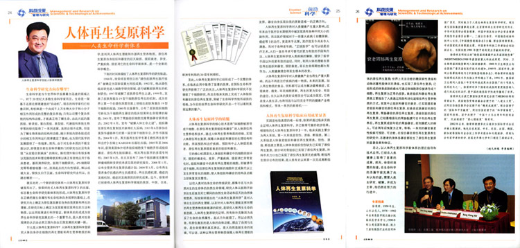 至此,人體再生復原科學已經(jīng)形成了一個完整的體系,在臨床應用中取得了顯著的效果,在國際生命科學研究界獲得了廣泛的關注。人體再生復原科學研究不僅繼續(xù)了干細胞研究,而且在臨床實踐上完成了人體組織和器官的原位再生復原,突破了生命科學傳統(tǒng)而頑固的桎梏,為今后的世界生命科學研究開啟一個可以看到美麗遠景的窗戶。
