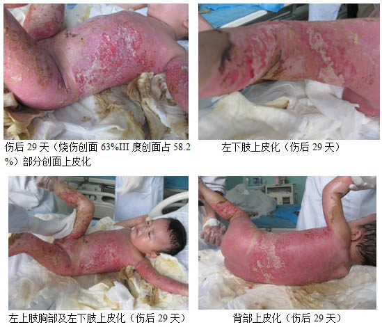 患者李某某, 2歲,安微阜陽人。小兒墜入鍋內(nèi)沸水中,全身燙傷總面積63%,II度深型占4.8%,III度淺型占58.2%,傷后29天,在人體皮膚原位再生醫(yī)療技術(shù)規(guī)范治療下創(chuàng)面60%已上皮化。創(chuàng)面按照皮膚的生理性愈合的規(guī)律進行生理性愈合。