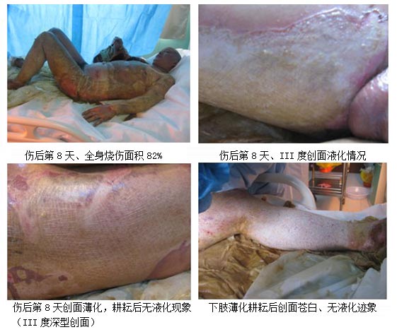 上期報導(dǎo)金某某,男,46歲,強堿水燒傷了全身,全身燒傷面積占80%,順利度過了休克期。傷后第8天在人體皮膚原位再生技術(shù)規(guī)范治療下,II度深型創(chuàng)面占3%已開始液化,III度淺型18%創(chuàng)面開始液化,III度深型創(chuàng)面薄化耕耘呈白色皮革樣,無液化跡象。