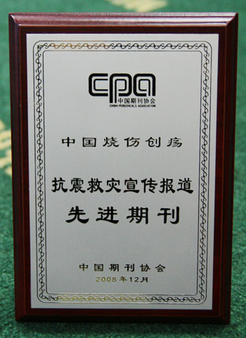 中國期刊協會為了表彰先進,于今年8月在全國期刊界開展了評選抗震救災宣傳報道先進期刊及先進個人的活動,在經過中宣部出版局、民政部、新聞出版總署有關部門的領導和業(yè)界專家組成的評審委員會進行認真評審后,決定授予106種期刊“全國抗震救災宣傳報道先進期刊”的榮譽稱號,《中國燒傷創(chuàng)瘍雜志》在全國九千多種期刊中涌現了出來,獲此殊榮。