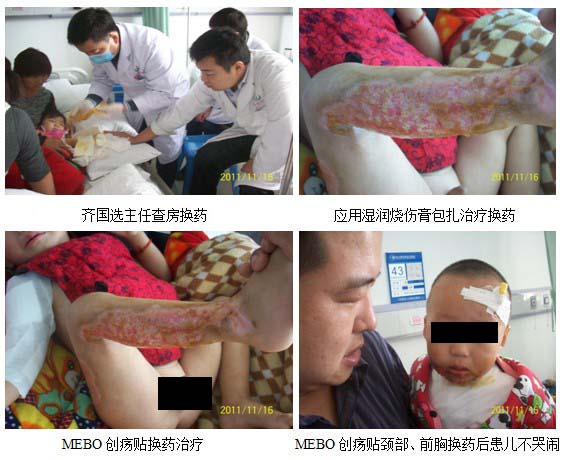 14日~17日,杜福勤主任再次來到燒傷科,在齊國選主任的帶領(lǐng)下看望了住院的燒傷和整形患者,并給予再生技術(shù)處理換藥。15日給予示范換藥治療,得到患者及家屬的認(rèn)可和歡迎,特別是幼兒患者,應(yīng)用再生技術(shù)換藥后,患兒立即停止哭鬧;16日,應(yīng)用MEBO創(chuàng)瘍貼給頸胸部燙傷患兒和上下肢燒傷植過自體皮的患兒換藥治療,收到了良好的臨床效果。