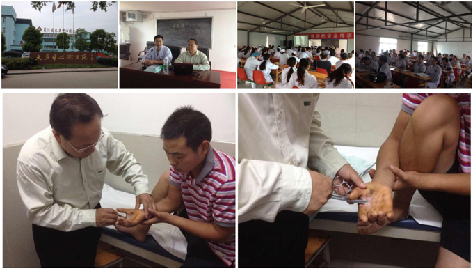 2014年9月23日趙瑞慶教授在徐州市大吳鎮(zhèn)中心衛(wèi)生院舉辦了一期院級燒傷創(chuàng)瘍再生醫(yī)學與療法培訓班。李輝院長主持了會議,培訓人數(shù)82人。培訓后趙教授深入外科病房會診電擊傷病人。