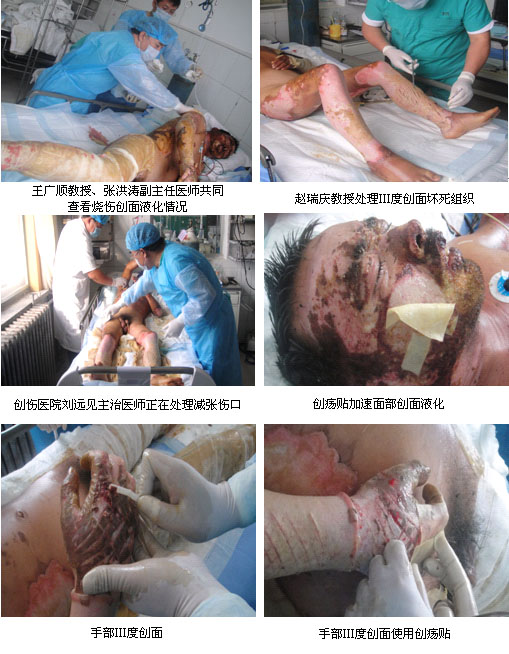 9月16日,牡丹區(qū)呂陵鎮(zhèn)某特種鋼煉鋼廠工人們正在翻砂澆鑄正常作業(yè),下午13:00時因翻砂磨具受潮,燒鑄鐵水后濺起的鐵水、引起蒸汽、沙粒、汽霧、把正在作業(yè)的翻砂工人馮某、霍某掀倒,導(dǎo)致2名工人大面積燒傷,事后鋼廠工友們用車將2人急送到菏澤市創(chuàng)傷醫(yī)院進(jìn)行搶救,醫(yī)院領(lǐng)導(dǎo)得知后立即開啟緊急綠色急救通道,直接由急診室轉(zhuǎn)入手術(shù)室、ICU病房,聯(lián)合組成普外科、ICU搶救小組,患者馮某:燒傷面積 80%TBSA;患者霍某:燒傷面積60%TBSA,兩名患者均為Ⅲ度燒傷創(chuàng)面各占到50% TBSA。中國中西醫(yī)結(jié)合學(xué)會燒傷專業(yè)委員會委員趙瑞慶教授、王廣順教授也在第一時間趕到搶救現(xiàn)場與該院醫(yī)生共同討論分別對2名傷員采取人性化的個體搶救方案,針對危重患者積極采取開通靜脈雙通道,抗休克、抗感染等支持療法,創(chuàng)面處理全部使用燒傷再生醫(yī)療技術(shù),Ⅲ度燒傷創(chuàng)面采用耕耘減張后,規(guī)范全程運(yùn)用再生醫(yī)療技術(shù)救治,經(jīng)過該院醫(yī)生的積極搶救,在患者入院12天后,患者的病情得到了有效地控制,較平穩(wěn)的度過了休克期、感染期、目前創(chuàng)面進(jìn)一步轉(zhuǎn)入后期處理階段。