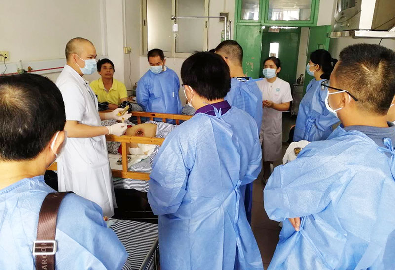 醫(yī)療專(zhuān)家們一行首先前往燒傷與創(chuàng)面修復(fù)科病房觀摩再生醫(yī)療技術(shù)在燒傷、糖尿病足潰瘍、壓瘡等創(chuàng)面的規(guī)范化治療。病房觀摩后,各醫(yī)療專(zhuān)家到會(huì)議室就再生醫(yī)療技術(shù)在慢性及難愈性創(chuàng)面的規(guī)范化應(yīng)用進(jìn)行了具體的學(xué)術(shù)交流及探討。就再生醫(yī)療技術(shù)在糖尿病足潰瘍、壓瘡創(chuàng)面、糖尿病足潰瘍及皮膚病的良好應(yīng)用效果進(jìn)行了交流,還特別分享了再生醫(yī)療技術(shù)在眼鏡蛇咬傷創(chuàng)面的臨床處理等。