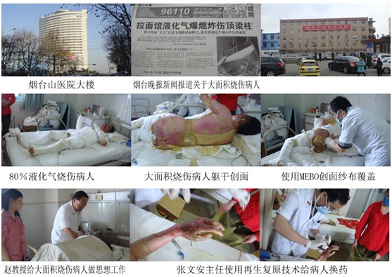 煙臺山醫(yī)院燒傷整形科曾在2011年10月份在張文安主任的帶領(lǐng)下使用再生復(fù)原技術(shù)治療一例85%大面積燒傷病人獲得成功。此例80%液化氣燒傷病人剛送到醫(yī)院,血壓下降,張文安主任沉著應(yīng)戰(zhàn)雙通道液體輸入抗休克搶救,并早期進(jìn)行簡易清創(chuàng)后創(chuàng)面用MEBO覆蓋(因病人信仰伊斯蘭教)。在第一時(shí)間北京燒傷創(chuàng)瘍研究所趙瑞慶教授也趕到搶救現(xiàn)場指導(dǎo)進(jìn)一步治療。