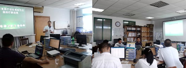 會議在下午3:00分在該科教研室兼辦公室舉行,黃武全主任主持學(xué)術(shù)會議,戴衛(wèi)平副院長參加了會議,該科普外科、肛腸科、骨科、燒傷外科學(xué)組醫(yī)護(hù)人員認(rèn)真聆聽了此次培訓(xùn)。王主任的專題學(xué)術(shù)報告分為三部分,在第一部分概述中,王主任重點(diǎn)講述了我國著名生命科學(xué)家、醫(yī)學(xué)家徐榮祥教授近年來在人體再生復(fù)原科學(xué)研究領(lǐng)域所取得的重大臨床及實(shí)驗(yàn)研究成果,2012年分別發(fā)表在《英國外科雜志》和《國際燒傷雜志》2篇綜述中有關(guān)磺胺嘧啶銀及含銀敷料等外用銀制劑用于急性創(chuàng)傷和燒傷創(chuàng)面會造成創(chuàng)面愈合延遲、增加疼痛和感染率的最新觀點(diǎn),以及再生復(fù)原療法的概念及其解決難愈性創(chuàng)面治療的機(jī)理;第二部分重點(diǎn)介紹了再生復(fù)原療法創(chuàng)面規(guī)范的處理方法;第三部分重點(diǎn)講述了再生復(fù)原療法在各類難愈性創(chuàng)瘍創(chuàng)面治療要點(diǎn)及典型病例介紹,并結(jié)合大量的病例圖片講解了各類深度燒傷創(chuàng)面、再生醫(yī)療技術(shù)在骨外露、鋼板外露、糖尿病足、動脈閉塞癥、撕脫傷、斷肢再生、手術(shù)切口感染、褥瘡等各種難愈合創(chuàng)面的治療過程及要點(diǎn)。會議持續(xù)到近6點(diǎn)才結(jié)束。戴院長代表醫(yī)院對王主任的到來表示感謝,并表示受益匪淺,王主任的講座進(jìn)一步加深了該院對原位再生技術(shù)的認(rèn)識,他們表示將在臨床中更加規(guī)范的使用該項(xiàng)技術(shù),為患者造福!