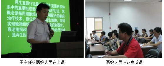 2011年06月14日,中國(guó)中西醫(yī)結(jié)合學(xué)會(huì)燒傷專業(yè)委員會(huì)常委、中國(guó)燒傷創(chuàng)瘍雜志社副總編輯、北京燒傷創(chuàng)瘍研究所副所長(zhǎng)、臨床部主任王洪生研究員應(yīng)邀到該醫(yī)院以“再生復(fù)原療法療法在燒傷及難愈性創(chuàng)面臨床規(guī)范化應(yīng)用及新進(jìn)展”為題進(jìn)行了專題講座。該院外科、骨科,以及內(nèi)科等護(hù)理人員參加了講座,在學(xué)術(shù)講座中,王主任對(duì)燒傷及各種難愈性創(chuàng)傷,潰瘍創(chuàng)面的規(guī)范處理方法與技巧并結(jié)合臨床圖片做了詳細(xì)地講解。