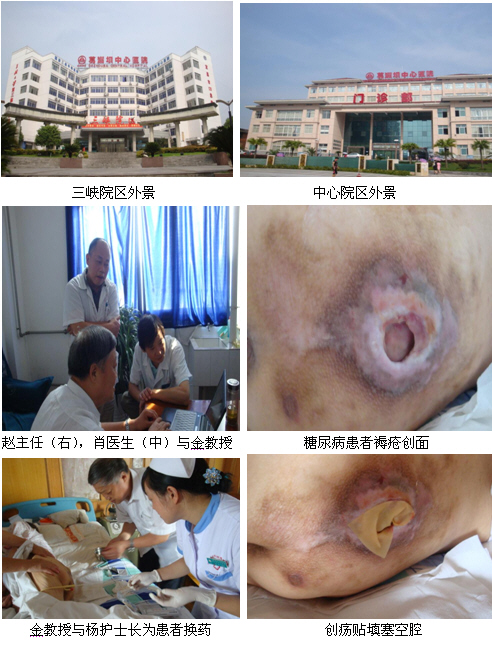 8月11日至8月13日,中國中西醫(yī)結合學會燒傷專業(yè)委員會金黨軍教授走訪了該醫(yī)院三峽院區(qū)和中心院區(qū)的部分科室。金教授在走訪期間分別與三峽院區(qū)外科趙延春主任、楊護士長,中心院區(qū)普外一科李明堃主任,急診外科劉錫丹主任和皮膚美容科朱云飛主任進行了技術交流。趙延春主任在臨床一直推廣應用濕潤燒傷膏和濕性醫(yī)療技術為大面積燒傷患者治療,非常肯定其卓越的臨床療效。在金教授拜訪趙延春主任時,他正為一位因腹腔鏡手術插管形成的洞傷口患者應用美寶創(chuàng)瘍貼換藥。在金黨軍教授向趙主任和科室骨干肖醫(yī)生介紹了目前再生醫(yī)療技術臨床實踐新進展后,他們表示通過對皮膚再生醫(yī)療技術對創(chuàng)傷、潰瘍創(chuàng)面治療良好效果的考察,他們正在構思創(chuàng)瘍特色專業(yè)科室的建立。