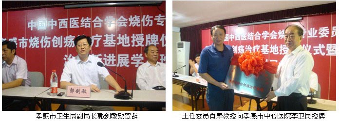 2011年8月28日,由孝感市中心醫(yī)院主辦成立了中國中西醫(yī)結合學會燒傷專業(yè)委員會孝感市燒傷創(chuàng)瘍治療基地醫(yī)院。會議在孝感市中心醫(yī)院仁濟堂三樓學術報告廳隆重召開。出席本次會議的有中國中西醫(yī)結合學會燒傷專業(yè)委員會主任委員、中國燒傷創(chuàng)瘍雜志社社長、燒傷創(chuàng)瘍中心研究所所長肖摩教授;中國中西醫(yī)結合學會燒傷專業(yè)委員會委員、燒傷創(chuàng)瘍研究所副所長金黨軍教授:孝感市衛(wèi)生局郭建敏局長;孝感市衛(wèi)生局人事科教科科長、市醫(yī)學會胡安全秘書長;孝感市中心醫(yī)院李為民院長;孝感市第一人民醫(yī)院、孝感市第三人民醫(yī)院、孝感市婦幼保健院、應城市人民醫(yī)院、大悟縣人民醫(yī)院及各鄉(xiāng)鎮(zhèn)衛(wèi)生院醫(yī)護人員130余人參加了此次會議。
