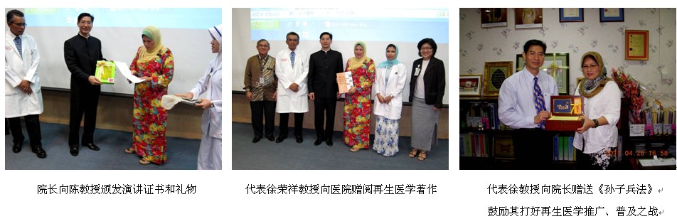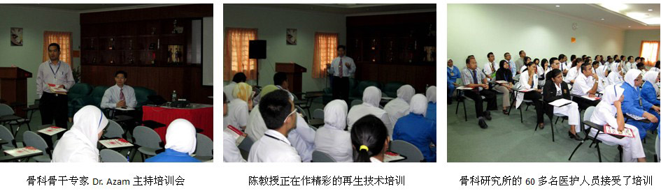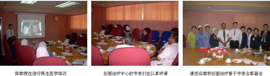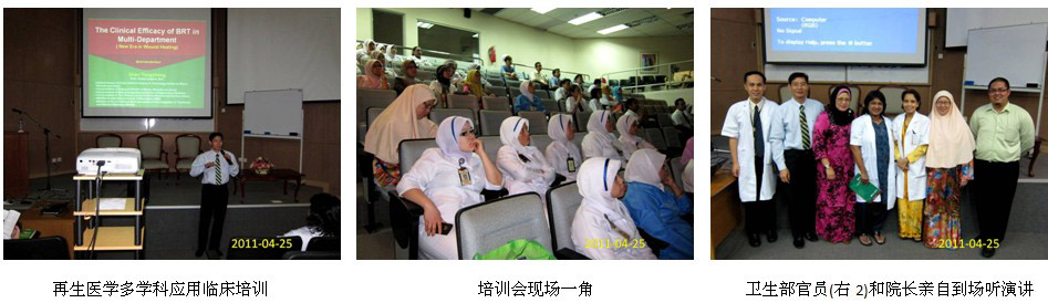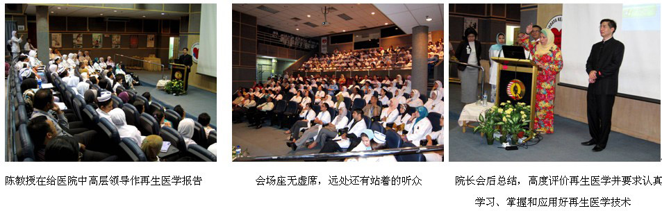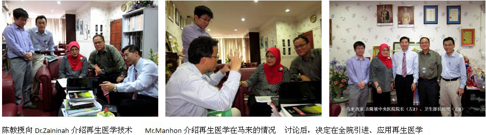 一年后(2011年4月),當(dāng)醫(yī)院院長(zhǎng)Dato & Dr. Zaininah獲知陳教授再次來到吉隆坡時(shí),馬上約陳教授到辦公室做客。聽完陳教授對(duì)再生醫(yī)學(xué)的介紹后,院長(zhǎng)非常激動(dòng),堅(jiān)定馬上組織起全院的各科主任和護(hù)士長(zhǎng),請(qǐng)陳教授進(jìn)行再生醫(yī)學(xué)報(bào)告和進(jìn)行培訓(xùn),同時(shí)還組織召開了專題會(huì)議,商討全面引進(jìn)再生醫(yī)學(xué)技術(shù)和展開臨床研究、申請(qǐng)將MEBO盡快進(jìn)入到國(guó)家基本用藥范圍的計(jì)劃等。