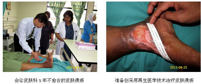 全院的學(xué)術(shù)報(bào)告結(jié)束后,陳教授先后應(yīng)邀到骨科、整形燒傷科、創(chuàng)面治療中心、皮膚科等科室進(jìn)行再生醫(yī)學(xué)臨床技術(shù)培訓(xùn),先后培訓(xùn)了醫(yī)護(hù)人員400多名。期間,陳教授還先后應(yīng)邀到燒傷整形科、兒科研究所燒傷中心、創(chuàng)傷骨科、創(chuàng)面治療中心、婦產(chǎn)科、皮膚科等科室和部門,會(huì)診指導(dǎo)了燒傷、創(chuàng)傷、潰瘍、外科和皮膚科難愈合創(chuàng)面14例的治療,指導(dǎo)和示范微粒皮種植培養(yǎng)再生技術(shù)1例,均獲得理想的臨床效果。再生醫(yī)學(xué)的臨床效果在吉隆坡中央醫(yī)院已經(jīng)得到充分的肯定和認(rèn)可,再生醫(yī)學(xué)技術(shù)在吉隆坡中央醫(yī)院的地位變得不可替代和不可動(dòng)搖。以下是部分工作圖片,和讀者共同分享。