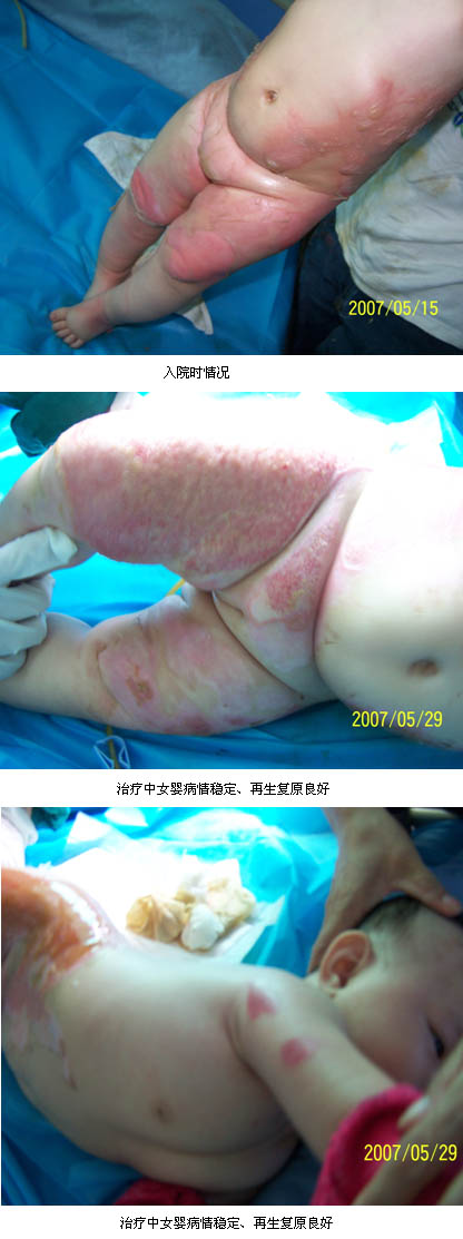 2007年5月16日,一個只有4個月大小的女嬰被家長急送到中山市黃圃人民醫(yī)院燒傷創(chuàng)瘍科,原來該患兒在半小時(shí)前被剛燒滾的熱水燙傷了,入院時(shí)檢查,患兒精神萎靡不振,哭聲低,表情淡漠。反應(yīng)差。入院診斷:燒傷休克,大面積特重度熱水燙傷40%TBSA(淺II度5%TBSA,深I(lǐng)I度淺型15%TBSA,深I(lǐng)I度深型10%TBSA,III度淺型5%TBSA,III度深型5%TBSA)。入院后,經(jīng)過積極的抗休克、抗感染等綜合治療,同時(shí)規(guī)范應(yīng)用皮膚原位再生技術(shù)進(jìn)行創(chuàng)面處理,盡管患兒一度出現(xiàn)SIRS表現(xiàn),但由于規(guī)范應(yīng)用皮膚原位再生醫(yī)療技術(shù),患兒平穩(wěn)度過了休克期和創(chuàng)面液化期和高代謝期,經(jīng)過35天的治療患兒創(chuàng)面全部自行愈合。