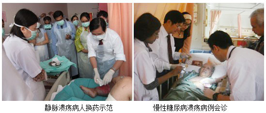 在多家醫(yī)院授課后,還安排了病人會(huì)診及不同創(chuàng)面換藥操作規(guī)范示范,每次的示范中醫(yī)療開發(fā)團(tuán)隊(duì)被醫(yī)院的業(yè)務(wù)人員層層包圍,爭(zhēng)先恐后地觀察記錄整個(gè)操作流程,生怕遺漏一絲一毫的細(xì)節(jié),并不時(shí)提出相關(guān)問題,胡教授都給予耐心、細(xì)致、全面的解答,使所有的示范教學(xué)活動(dòng)開展的有聲有色、在活躍而嚴(yán)謹(jǐn)?shù)姆諊兄庇^有效地規(guī)范了醫(yī)務(wù)人員的技術(shù),提高了醫(yī)務(wù)水平。