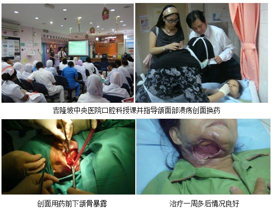 在整個(gè)醫(yī)療開發(fā)過程中,醫(yī)療開發(fā)團(tuán)隊(duì)也結(jié)識(shí)了許許多多醫(yī)界同仁并成為良好的伙伴,如Dr. Nurhalizah,她是在全馬最大政府醫(yī)院吉隆坡中央醫(yī)院婦產(chǎn)科工作的資深主任醫(yī)師,同時(shí)也是再生醫(yī)學(xué)忠實(shí)的追隨者和實(shí)踐人,在胡教授的指導(dǎo)下,經(jīng)她規(guī)范應(yīng)用再生醫(yī)學(xué)技術(shù)治療的多例婦產(chǎn)科手術(shù)切口感染病人很快就成功地治愈并康復(fù)出院。嘗到了先進(jìn)技術(shù)和產(chǎn)品帶來的勝利的喜悅后,她又無私地將該技術(shù)引薦給該院的口腔科,幫助該科解決一例頭疼的難愈性創(chuàng)面。這例有糖尿病史的病人在拔牙后感染引起右頜面部整個(gè)組織的潰爛,連下頜骨都暴露出來,慘不忍睹。經(jīng)胡教授的指導(dǎo)和示教換藥后一周,該患者的病情穩(wěn)定,創(chuàng)面明顯得到了改善,新生肉芽組織長勢(shì)良好,而隨后的授課講解進(jìn)一步打消了醫(yī)生們對(duì)下一步治療的所有疑惑和顧慮,掌握了要領(lǐng),使醫(yī)生們感到驚奇的同時(shí)建立了百倍的信心。