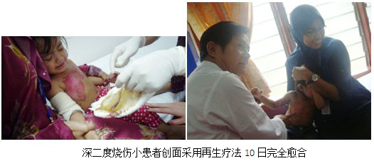 另一例會(huì)診的病例也是來自吉隆坡中央醫(yī)院,患者是該院康復(fù)科一名醫(yī)生年幼的女兒,不幸被開水燙傷,整個(gè)胸部和右上臂為深二度燒傷,在美寶醫(yī)療團(tuán)隊(duì)到來之前,他們使用干性輔料給予治療,不僅效果不明顯,且干性療法的紗布與創(chuàng)面嚴(yán)重粘連,使每次的換藥都成了孩子最難以忍受的折磨。萬般無奈之時(shí),該醫(yī)生得知美寶醫(yī)療隊(duì)在大馬的情況并隨即發(fā)出求助,經(jīng)胡主任的會(huì)診,該小患者立刻改用再生療法并在10天之內(nèi)就全部愈合,換藥再也不哭不鬧,家人和醫(yī)生都十分感激。