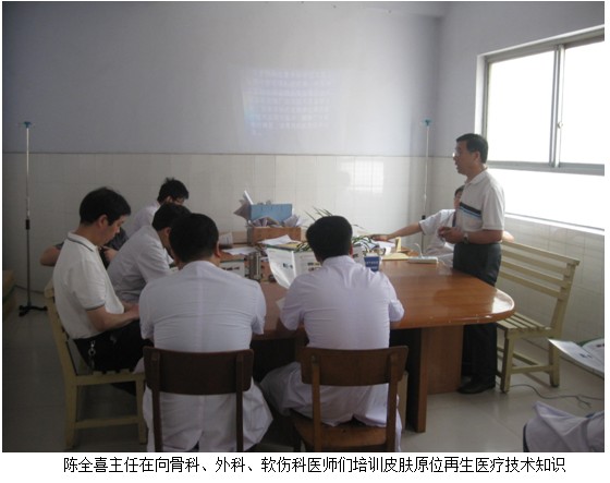 2012年6月2號上午,中國中西醫(yī)結(jié)合學(xué)會燒傷專業(yè)委員會委員、北京美寶燒傷創(chuàng)瘍研究所臨床部技術(shù)推廣專家陳全喜主任應(yīng)邀來到洛陽市孟津縣人民醫(yī)院骨科、外科、軟傷科,進(jìn)行了科室的皮膚原位再生醫(yī)療技術(shù)培訓(xùn)。