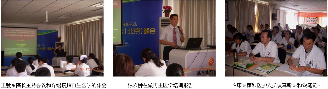 2011年8月15日下午2時30分,再生醫(yī)學(xué)專題培訓(xùn)會在醫(yī)院的四樓會議室按時召開。醫(yī)院糖尿病潰瘍科的全體醫(yī)護(hù)人員和其它科室的大部分技術(shù)骨干30余人參加這次培訓(xùn)會,培訓(xùn)會由王愛東院長主持,她向大家介紹了在一次國際糖尿病會議上認(rèn)識陳教授的經(jīng)過和聆聽了陳教授的再生醫(yī)學(xué)報告后的感受,要求各位專家和護(hù)理人員認(rèn)真聽課,利用這次難得的機(jī)會學(xué)習(xí)掌握好皮膚再生復(fù)原技術(shù)。陳教授則根據(jù)該醫(yī)院的特色,專門準(zhǔn)備了培訓(xùn)演講內(nèi)容,在將近2小時的培訓(xùn)會里,以“The New Development of In Situ Tissues and Stem Cells Cultivation Technique for Diabetic Wound Healing (組織干細(xì)胞原位培養(yǎng)技術(shù)治療糖尿病潰瘍新進(jìn)展)”為題,分以下四個部分向大家做了一次較為系統(tǒng)而又通俗易懂的培訓(xùn):1、燒傷皮膚原位再生醫(yī)學(xué)的發(fā)明創(chuàng)立與燒傷皮膚再生復(fù)原臨床實效;2、K-19型干細(xì)胞原位培養(yǎng)再生燒傷全厚皮壞死皮膚的機(jī)理; 3、皮膚原位再生技術(shù)在糖尿病潰瘍領(lǐng)域應(yīng)用新進(jìn)展;4、皮膚原位再生復(fù)原技術(shù)創(chuàng)面治療臨床規(guī)范。培訓(xùn)報告很受大家的歡迎,大家聽得非常認(rèn)真和投入,認(rèn)為這次的培訓(xùn)太及時、太重要了!大家都為學(xué)習(xí)和了解到如此先進(jìn)而又簡單易學(xué)的新技術(shù)感到無比的激動和興奮。北京中西醫(yī)結(jié)合學(xué)會燒傷專業(yè)委員會的彭韶君秘書、何蓮老師和郭軍老師到會免費為這次培訓(xùn)會的醫(yī)護(hù)人員提供了再生醫(yī)學(xué)資料也很受歡迎。