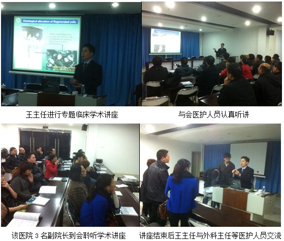 當(dāng)晚的學(xué)術(shù)講座由該院外科主任魏啟財(cái)主持,其中主管副院長兼骨科主任林裔豐副主任醫(yī)師、副院長兼皮膚科主任林新鈺副主任醫(yī)師及連健兒副院長等院方領(lǐng)導(dǎo)也到會聆聽了學(xué)術(shù)講座。在專題學(xué)術(shù)講座中,王主任向醫(yī)生們介紹了燒傷濕潤暴露療法,闡述了燒傷皮膚原位再生醫(yī)療技術(shù)原理,與傳統(tǒng)醫(yī)學(xué)療法相比再生醫(yī)療技術(shù)的優(yōu)越性等;著重講解了暴露療法、半暴露療法和包扎療法的操作方法及要點(diǎn);通過臨床病例圖片側(cè)重分析褥瘡、典型糖尿病足、下肢潰瘍等外科常見創(chuàng)傷治療前后過程。重點(diǎn)講述了再生療法在各種難愈性創(chuàng)面治療新進(jìn)展及增生性瘢痕防治進(jìn)展等新技術(shù)。最后還通過視頻講述了微粒皮種植技術(shù)的臨床操作。各種創(chuàng)面治療后理想的愈合效果讓醫(yī)生們對再生醫(yī)療技術(shù)有了更深刻的認(rèn)識,得到了在場領(lǐng)導(dǎo)及大家的認(rèn)可。