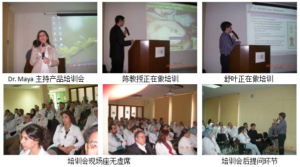 2. 2月23日早上10點(diǎn)半,美寶推廣團(tuán)隊(duì)再次來到賽達(dá)市,為當(dāng)?shù)匾患宜搅⒋髮W(xué)附屬醫(yī)院Hammoud Hospital的醫(yī)務(wù)人員進(jìn)行專門的疤痕軟膏培訓(xùn)。培訓(xùn)會由Dr. Maya主持,Dr. Maya是藥學(xué)的博士,現(xiàn)在負(fù)責(zé)美寶所有產(chǎn)品在黎巴嫩的經(jīng)營工作。醫(yī)院共計(jì)有60余名醫(yī)生、藥師、護(hù)士參加此次培訓(xùn)會。當(dāng)醫(yī)生們看到再生醫(yī)療技術(shù)及其配套產(chǎn)品在抗疤領(lǐng)域所取得驕人成績時(shí),詳細(xì)地詢問我們的產(chǎn)品和現(xiàn)在主流的產(chǎn)品硅膠貼有何不同等相關(guān)問題。負(fù)責(zé)產(chǎn)品推廣的舒葉解釋說,硅膠貼和疤痕平在抗疤的原理上有一小部分是相似的,那就是兩種產(chǎn)品都能保持創(chuàng)面的濕潤。但是硅膠貼使用合成的材料來保持創(chuàng)面濕潤,而疤痕平卻是用獨(dú)特的由天然成分蜂蠟和麻油組成的框架劑型來保持接近于正常皮膚水分丟失來保持創(chuàng)面濕潤,這是硅膠貼產(chǎn)品所不能比擬的;除此,疤痕軟膏中各種物質(zhì)能提供給細(xì)胞各種必需的營養(yǎng)成分,調(diào)節(jié)膠原蛋白正常生長,以此來達(dá)到預(yù)防和治療疤痕的效果。