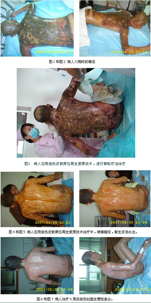 2007年4月13日13時04分,廣州花都中醫(yī)院收入一例成人燒傷,該患者蘇某某,男性,23歲。以“高溫漆料燙傷全身多處伴疼痛1小時”為主訴急診入院。患者于入院前1小時工作時,不慎被高溫脂類化學漆料燙燒傷全身多處,現(xiàn)場未作特殊處理,遂到花都中醫(yī)院急診求治,入院查體見:T36.0℃,P82次/分,R20次/分,BP120/90mmHg,神清,急性痛苦面容,頭、面、頸、雙上肢、軀干、臀部皮膚焦黃,炭化,部分表皮撕脫,表皮撕脫處可見創(chuàng)面蒼白,呈蠟白樣,間焦痂樣物,無水皰,無滲出,觸痛遲鈍,面部見表皮破潰,少理脫落,紅白相間,觸痛明顯,雙眼瞼毛燒焦狀,雙眼粗測視物無明顯異常,右耳輪呈蒼白色。入院診斷:高溫漆料全身燒傷總面積32%TBSA(深二Ⅱ度11%、淺Ⅲ度21%),特重度燒傷。入院后對患者創(chuàng)面處理全程應(yīng)用我國著名生命科學家徐榮祥教授發(fā)明的燒傷皮膚原位再生醫(yī)療技術(shù),進行抗休克、抗感染、營養(yǎng)支持、臟器功能保護等全身綜合治療,并在中國中西醫(yī)結(jié)合學會燒傷專委會常委、北京燒傷創(chuàng)瘍研究所副所長、臨床部王洪生主任的全程臨床指導下,患者順利的度過了休克關(guān)、感染關(guān),深Ⅱ度及淺Ⅲ度創(chuàng)面分別于傷后3周及5周左右生理性愈合。該患者的成功救治充分證明了燒傷皮膚原位再生醫(yī)療技術(shù)的顯著臨床治療效果。