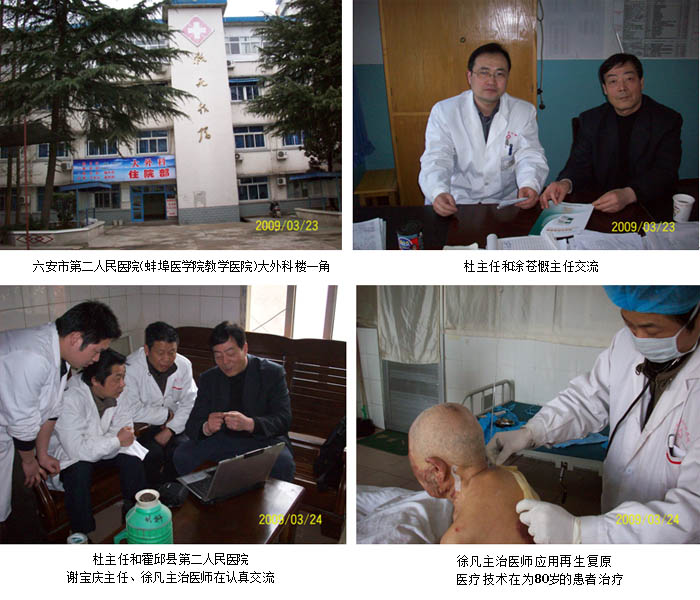 原位再生復(fù)原技術(shù)2009年在安徽革命老區(qū)深入推廣,中國中西醫(yī)結(jié)合學(xué)會燒傷專業(yè)委員會常委、北京燒傷創(chuàng)瘍研究所臨床部研究員、燒傷創(chuàng)瘍專家杜福勤主任應(yīng)邀走訪了安徽省六安市第二人民醫(yī)院(蚌埠醫(yī)學(xué)院教學(xué)醫(yī)院)外科、霍邱縣第二人民醫(yī)院外科。杜主任利用多媒體資料與六安市二院外科涂蒼慨主任、霍邱縣第二人民醫(yī)院外科謝寶慶主任、朱永主任、徐凡主治醫(yī)師進(jìn)行了“再生復(fù)原醫(yī)療技術(shù)在創(chuàng)瘍創(chuàng)面中療效”和“再生復(fù)原醫(yī)療技術(shù)理論與實踐—創(chuàng)傷與創(chuàng)傷愈合”的交流,交流中涂主任、謝主任、徐大夫?qū)υ偕鷱?fù)原醫(yī)療技術(shù)的神奇療效予以充分肯定,并各自談了自己的臨床實踐和體會。對再生復(fù)原醫(yī)療技術(shù)新產(chǎn)品速愈貼引起極大興趣,并提出臨床開發(fā)建議,希望速愈貼盡快能早日納入醫(yī)保和新農(nóng)合醫(yī)保目錄。造福廣大創(chuàng)瘍患者。
