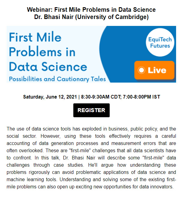 此前,芝加哥大學徐鵬智庫聯(lián)合牛津大學、劍橋大學、加州理工、阿斯本研究所等展開以“技術賦能未來”為核心的EquiTech Futures項目。為進一步利用科學技術解決復雜社會挑戰(zhàn),依托該項目,這些有抱負的創(chuàng)新組織徐鵬智庫及劍橋大學再度聯(lián)合召開了此次研討會。本次研討會上,劍橋大學Bhasi Nair博士通過案例研究對這些“第一英里”的數(shù)據(jù)挑戰(zhàn)進行了描述,并論證如何嚴謹?shù)乩斫膺@些問題才可以避免數(shù)據(jù)科學和機器學習工具的各種應用問題。