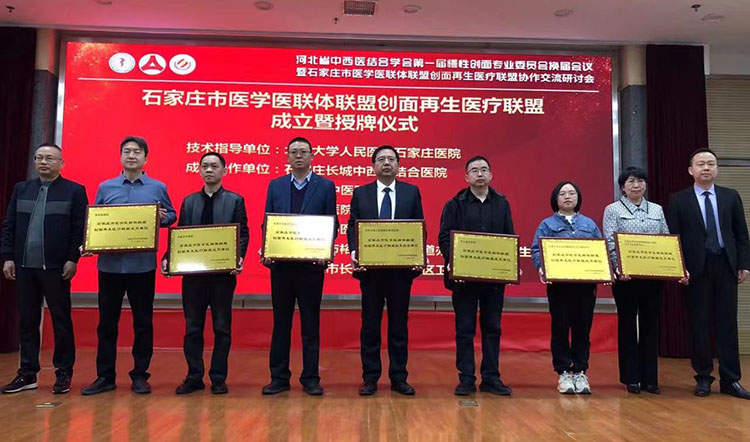 石家莊市醫(yī)學醫(yī)聯(lián)體聯(lián)盟創(chuàng)面再生醫(yī)療聯(lián)盟在此次大會上宣布成立。石家莊市醫(yī)學醫(yī)聯(lián)體聯(lián)盟是由北京大學人民醫(yī)院石家莊醫(yī)院牽頭成立的,此次依托石家莊市醫(yī)學醫(yī)聯(lián)體聯(lián)盟,成立了以技術協(xié)作交流為紐帶的專業(yè)聯(lián)盟組織。安雄彪副院長和方進勇教授為聯(lián)盟第一批成員單位授牌。