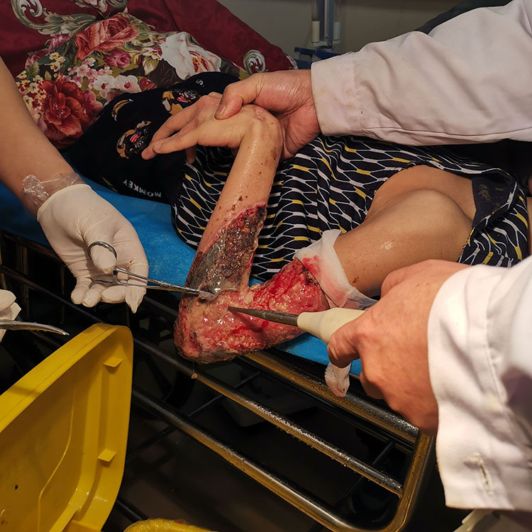 2月28日,應陽江市陽東區(qū)人民醫(yī)院骨二科李主任和梁主任邀請,北京榮祥再生醫(yī)學研究所副所長、中國中西醫(yī)結合學會燒傷專業(yè)委員會常務委員、《中國燒傷創(chuàng)瘍雜志》副總編輯、應用燒傷創(chuàng)瘍再生醫(yī)療技術治療糖尿病足領域專家王洪生主任應邀到該科室指導創(chuàng)面修復??平ㄔO及會診糖尿足潰瘍和壓瘡等慢性創(chuàng)面病人,并到手術室親自為三例慢性創(chuàng)面病人清創(chuàng)、換藥,指導創(chuàng)瘍再生醫(yī)療技術規(guī)范化應用,得到醫(yī)護人員和患者的高度好評。