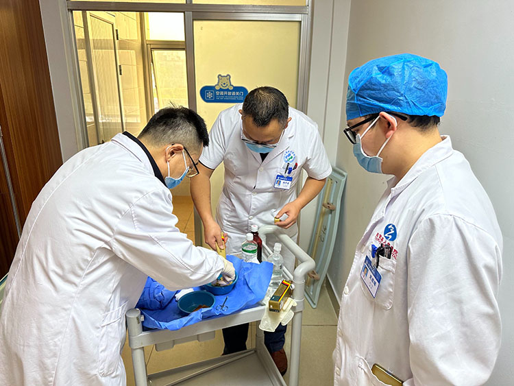 2023年2月27日,應霍邱縣第二人民醫(yī)院燒傷科主任徐凡的邀請,中國中西醫(yī)結合學會燒傷專業(yè)委員會醫(yī)療部張強主任來院會診2例燒傷和1例血管閉塞性潰瘍病人,現場講解了再生醫(yī)療技術換藥技術要點并演示做油紗換藥。