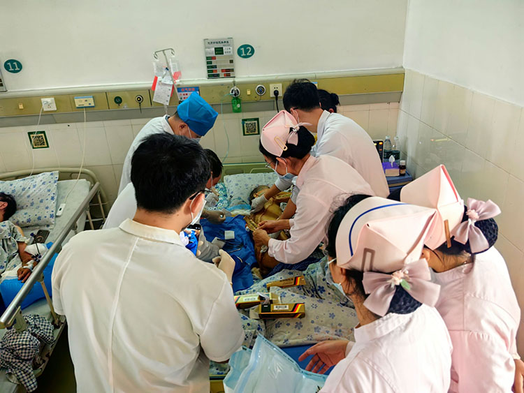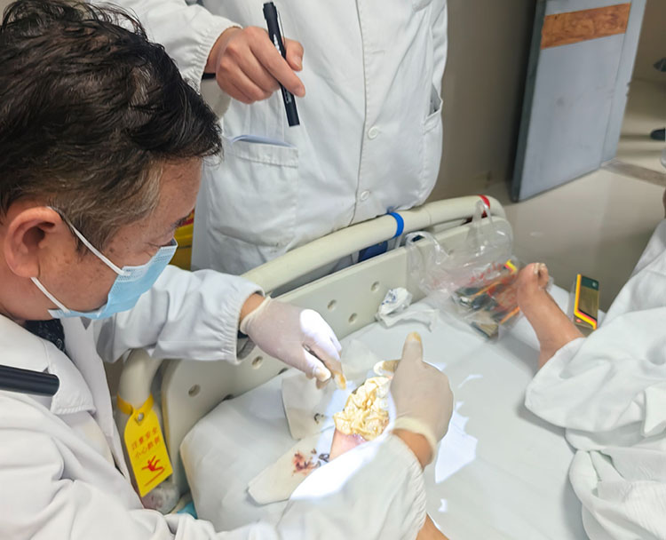 10月29日,應(yīng)九江學(xué)院附屬醫(yī)院創(chuàng)面修復(fù)科余東啟主任邀請,中國中西醫(yī)結(jié)合學(xué)會燒傷專業(yè)委員會臨床部、《中國燒傷創(chuàng)瘍雜志》編委、燒傷創(chuàng)瘍再生醫(yī)療技術(shù)臨床專家金黨軍主任前往科室進(jìn)行學(xué)術(shù)交流,并會診了兩名慢創(chuàng)患者,親自為患者清創(chuàng)換藥,贏得了醫(yī)護(hù)人員和患者家屬的高度贊許。