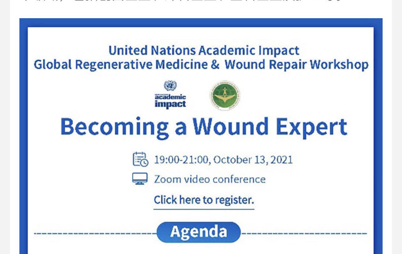 2021年10月14日,由國(guó)際再生醫(yī)學(xué)與創(chuàng)面修復(fù)學(xué)會(huì)主辦的聯(lián)合國(guó)學(xué)術(shù)影響力國(guó)際再生醫(yī)學(xué)線上培訓(xùn)活動(dòng)順利舉行。
