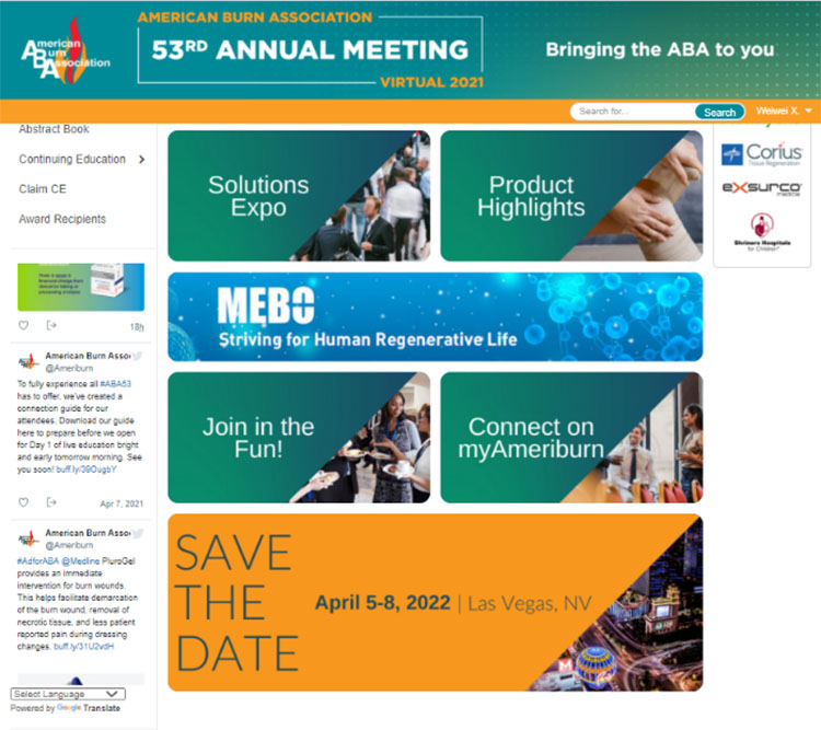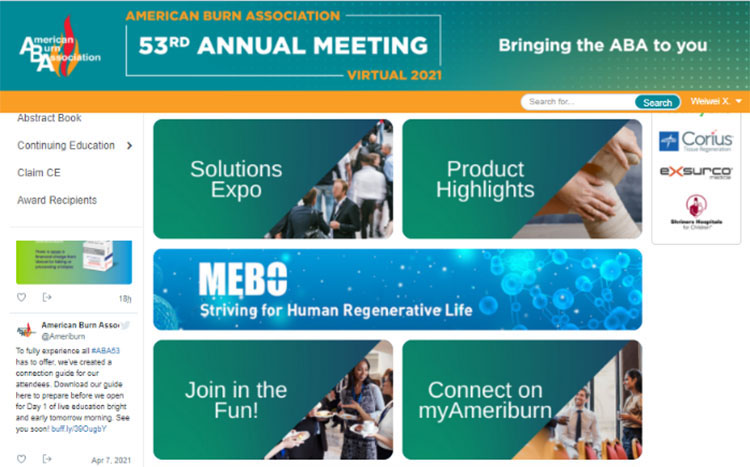 ABA線上會議不僅為燒傷領(lǐng)域的專家提供了良好的學(xué)術(shù)交流機(jī)會,也為各企業(yè)展示其產(chǎn)品與技術(shù)提供了廣闊的平臺,來自全球的40多家知名醫(yī)藥企業(yè)參加了此次會議。自2016年以來,美寶國際已經(jīng)連續(xù)4年參加了ABA年會:第49屆波士頓年會、第50屆芝加哥年會,第51屆拉斯維加斯年會,以及2020年線上會議。今年,美寶國際再度受邀參加2021年ABA線上會議,與全球?qū)<液推髽I(yè)一道,探索與推動燒傷治療的未來發(fā)展,并將繼續(xù)以再生生命科學(xué)領(lǐng)航者的身份,促進(jìn)全球再生生命科學(xué)的持續(xù)發(fā)展與科技創(chuàng)新。
