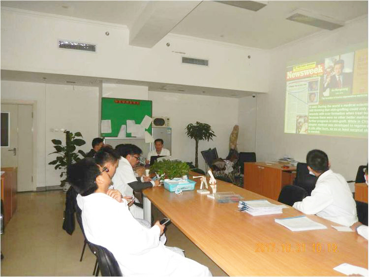 陳主任在示教室向來(lái)賓詳細(xì)介紹了運(yùn)用燒傷創(chuàng)瘍?cè)偕t(yī)療技術(shù)如何換藥,并指出它是不同于傳統(tǒng)的外科換藥,把換藥做到了極致。換藥時(shí)要掌握三不原則,即不疼痛、不出血、不干燥。到訪者表示受益匪淺。