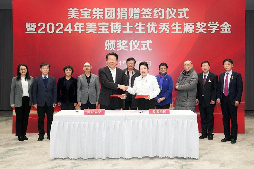 12 月 17 日,美寶集團(tuán)捐贈(zèng)簽約儀式暨 2024 年美寶博士生優(yōu)秀生源獎(jiǎng)學(xué)金頒獎(jiǎng)儀式在南開大學(xué)海冰樓舉行。當(dāng)天,南開大學(xué)津南校區(qū)“榮祥樓”正式揭牌。